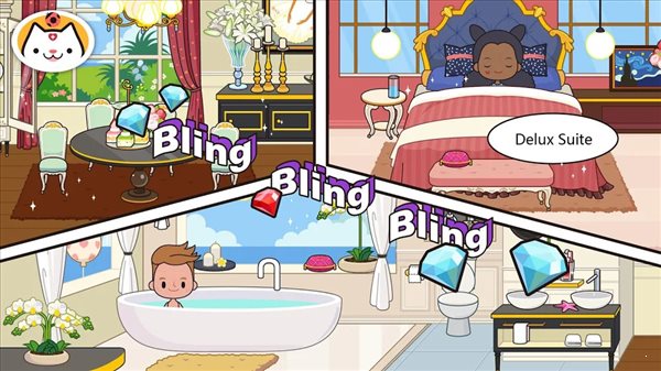 1.6个场景:家,度假区(酒店大厅,豪华套房,2个主题房间),海滩&小岛,观光区