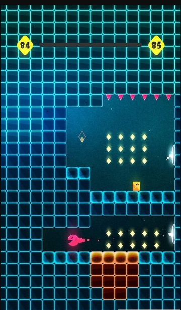 经历困难的关卡,收集钥匙,打开门并收集星星,游戏的机制基于角色的不断运动;它无法停止,所以你必须不断地偏离墙壁,将角色转向相反的方向,这是游戏玩法的主要元素;游戏中还有各种具有独特功能的街区,不同的玩法体验感不同。
