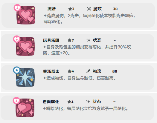技能效果非常全面,使用后菊花梨会进入萌化状态,同时还能提升自身30点防御和20点速度。这个技能为撒娇的爆发提供了必要的前置条件,是整套配招的启动器。
