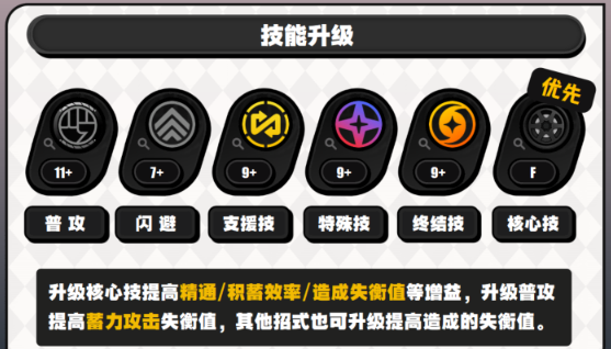 1、技能加点:核心技>普通攻击>特殊技>连携技>闪避/支援