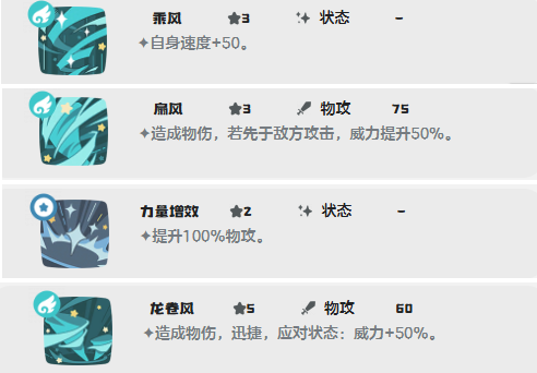 2、扇风(3能):造成物伤,若先于敌方攻击,威力提升50%。组合技,速度快等同于攻击力高。