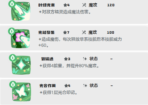 1、叶绿光束(4能):对敌方精灵造成魔法伤害。草系魔攻,稳定输出,克制水系。