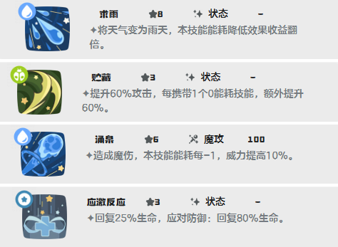 1、求雨(8能):将天气变为雨天,本技能能耗降低效果收益翻倍。稳定开雨天,配合潮湿岩石延长至7回合。