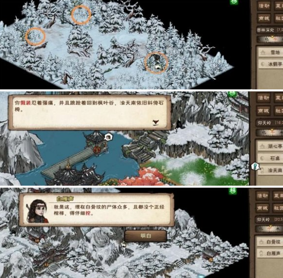 6、前往(32,5)触发剧情,原地挖掘三次继续推进剧情,与白雁声对话后,返回揽玉楼二楼对话百里司(8,3)再离开。
