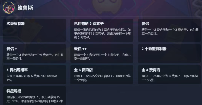 解析:这个的话有小复制器和低费商店,也有加5费的概率,赌狗95都能玩,看你怎么选择了,看你玩啥。如果选过2次韦鲁斯,4-7会有群星赐福(图上最后一个)。不但队伍星际增加后获得生命值,还增加5费卡的刷新几率。个人很喜欢。