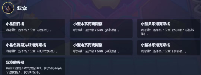 解析:简单来说就是选择格子进行强化,有火/木/社交名流/风/电/冰格子。如果选过2次亚索,4-7会有亚索的赐福(图上最后一个),所有格子效果增强50%,这个的话很适合那种单C的阵容。