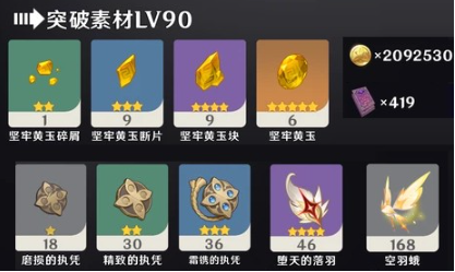 摩拉209w、大经验书*419、坚牢黄玉碎屑*1、坚牢黄玉断片*9、坚牢黄玉块*9、坚牢黄玉*6、空羽蛾*168、毁损的执凭*18、加固的执凭*30、精制的执凭*36、堕天的落羽*46等。