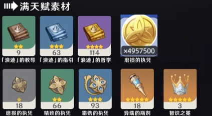 「浪迹」的教导*9、「浪迹」的指引*63、「浪迹」的哲学*114、毁损的执凭*18、加固的执凭*66、精制的执凭*93、升扬样本·战车*18、智识之冕*3、摩拉4957500;