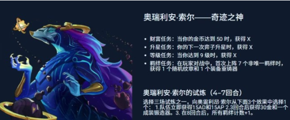 羁绊强化型阵容:优先选择奥瑞利安·索尔。选择后需完成财富积累、弈子升星、羁绊激活等相关任务,完成后可获得随机纹章、装备重铸器等奖励,助力玩家快速凑出高阶羁绊,强化阵容上限。