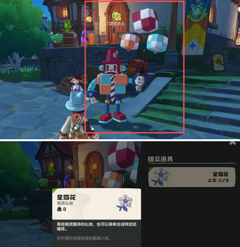 2、到了以后,我们找这个“门卫立方人”,然后进行交互,它就会给我们发布第一天的任务,要我们上交3个【星霜花】。