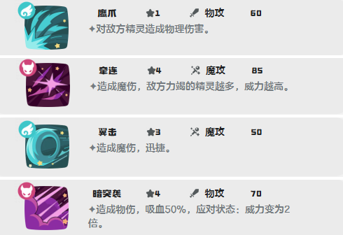 1、鹰爪(1能):对敌方精灵造成物理伤害。偷buff后直接爆发,收割残血。