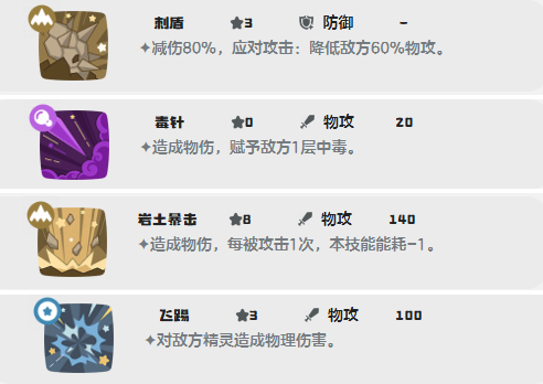 1、刺盾(3能):减伤80%,应对攻击:降低敌方60%物攻。最核心的技能,既能免伤,同时还能降低敌方物攻,十分适合特性效果。