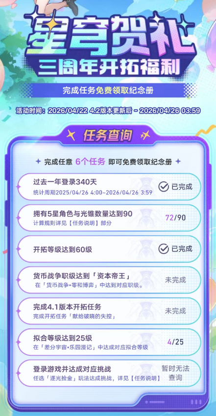 崩坏星穹铁道三周年纪念册怎么领-三周年纪念册领取条件及规则