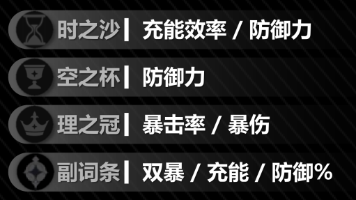 词条选择建议:[时之沙]视情况选择防御力或充能效率;[空之杯]选择防御力:[理之冠]视情况选择暴伤或暴击率;[副词条]优先选择双暴、充能、防御%。在三岩队中,充能建议155%+,不需要使用Q技能时,不需要考虑充能。