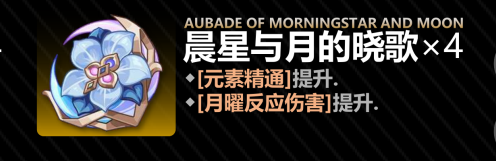 四件套:装备者处于队伍后台时,造成的月曜反应伤害提升20%;队伍的月兆等级至少为满辉时,造成的月曜反应伤害进一步提升40%。上述效果将在装备者位于场上3秒后移除。